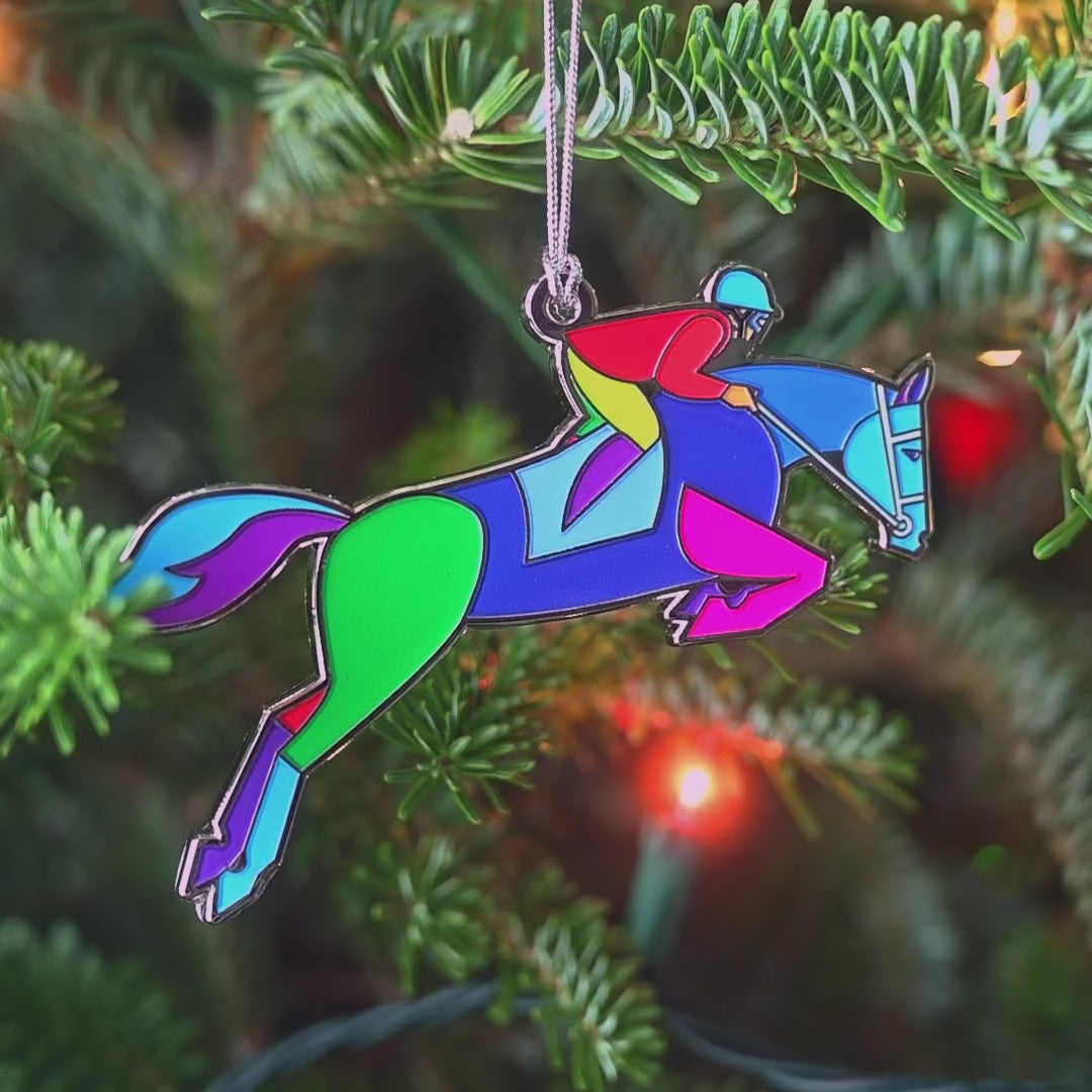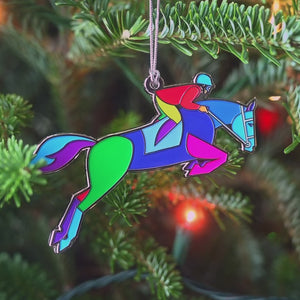 Expertly crafted from high-quality zinc and vibrant enamel, this ornament is finished with a protective epoxy glaze that brings its dynamic horse-jumping scene to life. Measuring 3.25" H x 4" W, it's the perfect statement piece for your Christmas tree, wreath, or holiday décor.